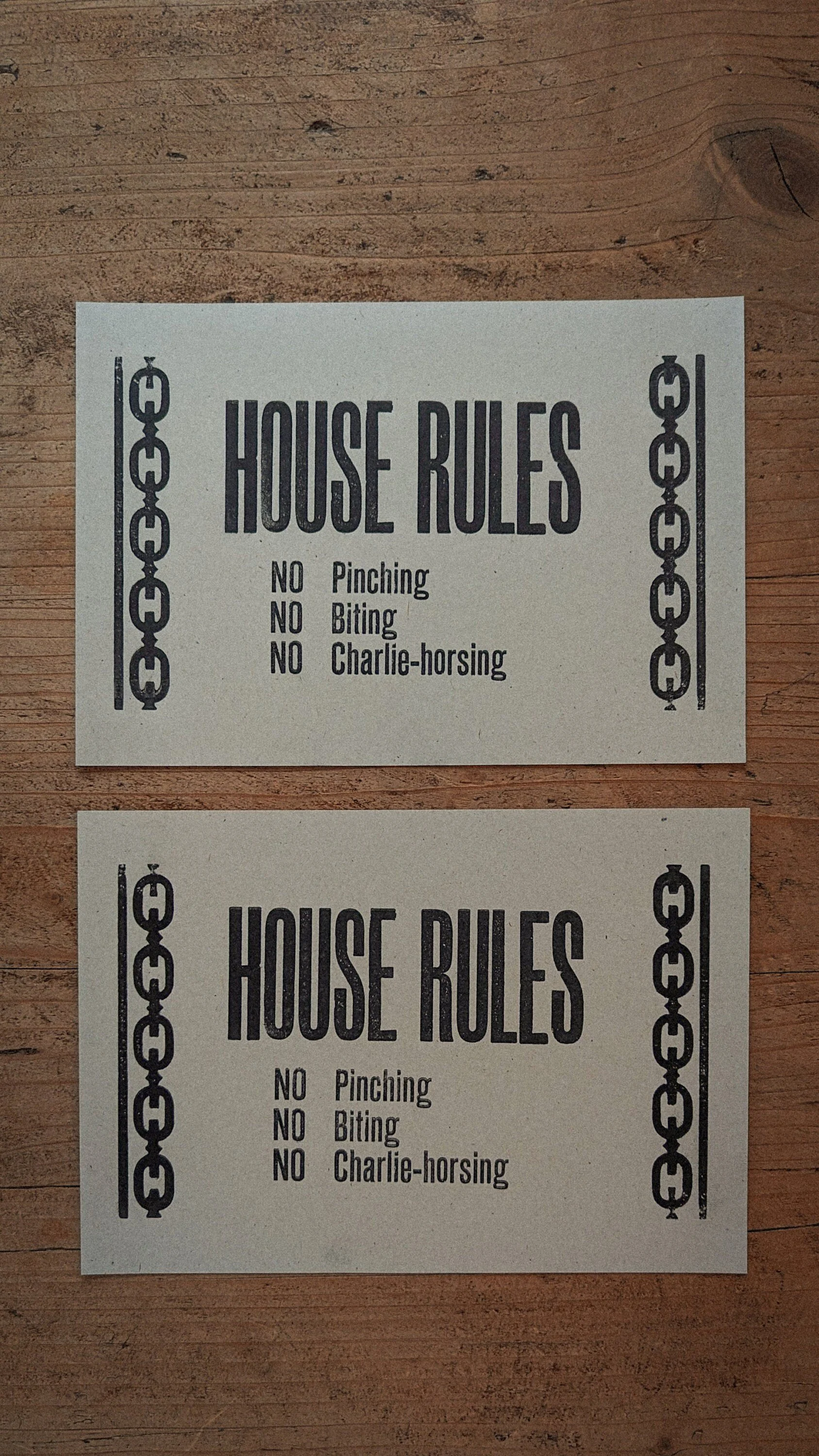 Image 1 of 2 Image 2 of 2 House Rules #1 - A5 Letterpress Print - SALE! £6.89 Letterpress printed on Adana 8x5 on a cream card.Please note that each print is an individual due to using old wooden type and as such has 'character' to it. Add To Cart Added! Letterpress printed on Adana 8x5 on a cream card.Please note that each print is an individual due to using old wooden type and as such has 'character' to it.
