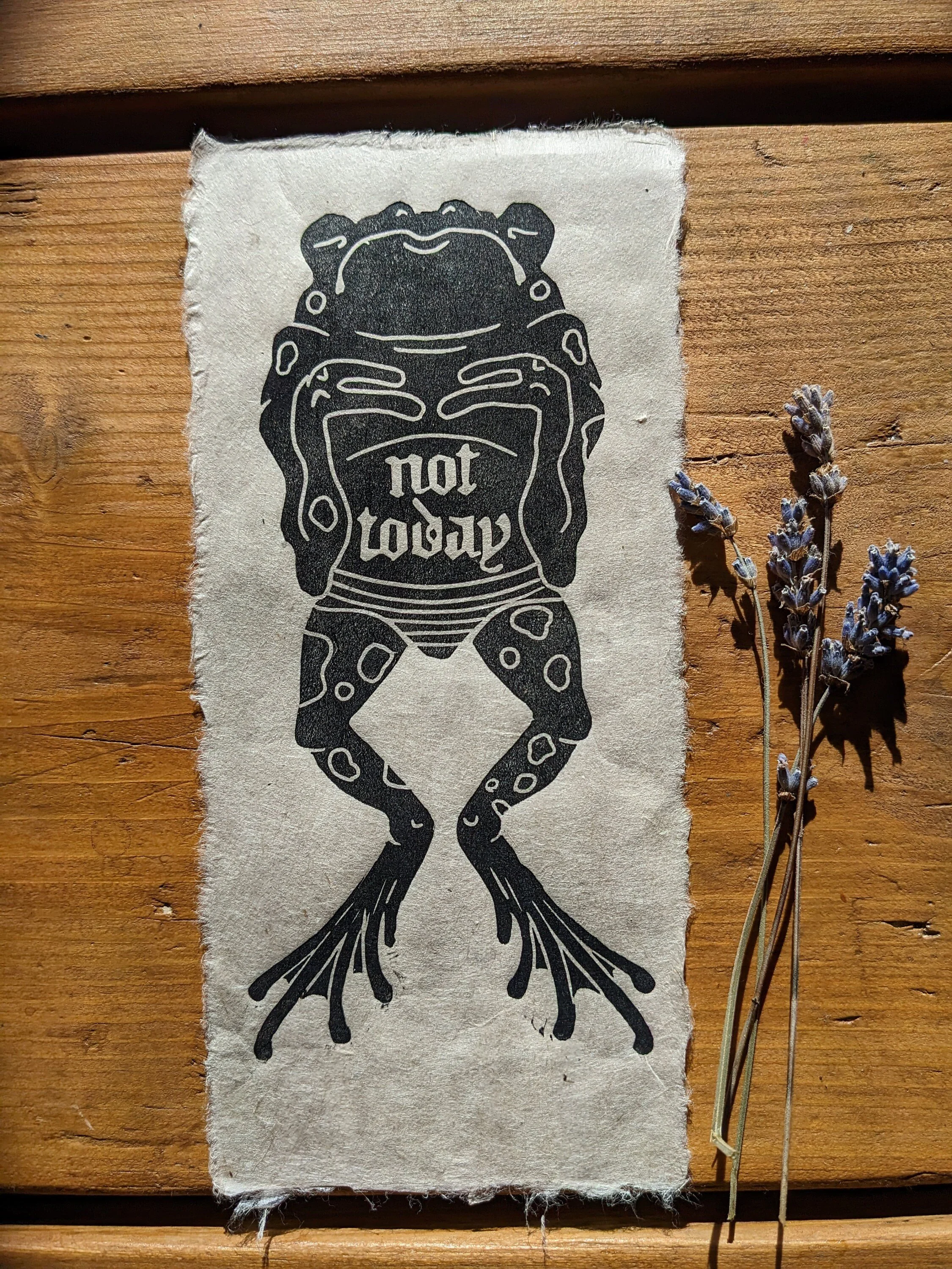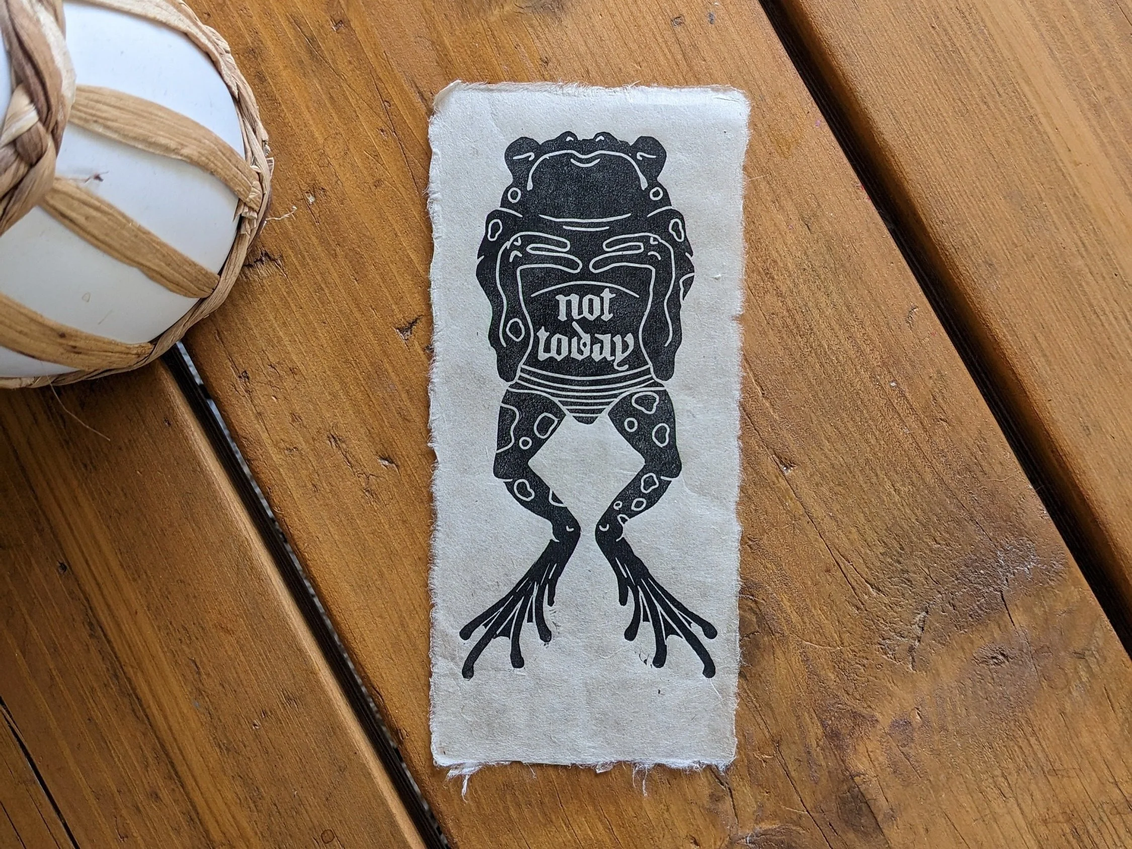 Image 1 of 2 Image 2 of 2 Original Handmade Black Ink Frog Linocut Print 'Not Today' £13.49 Hand-carved lino print on handmade 60gsm Washi Paper.210mm high, width can be 148mm or less.Currently unframed.Handprinted to order - Frank. Add To Cart Added! Hand-carved lino print on handmade 60gsm Washi Paper.210mm high, width can be 148mm or less.Currently unframed.Handprinted to order - Frank.